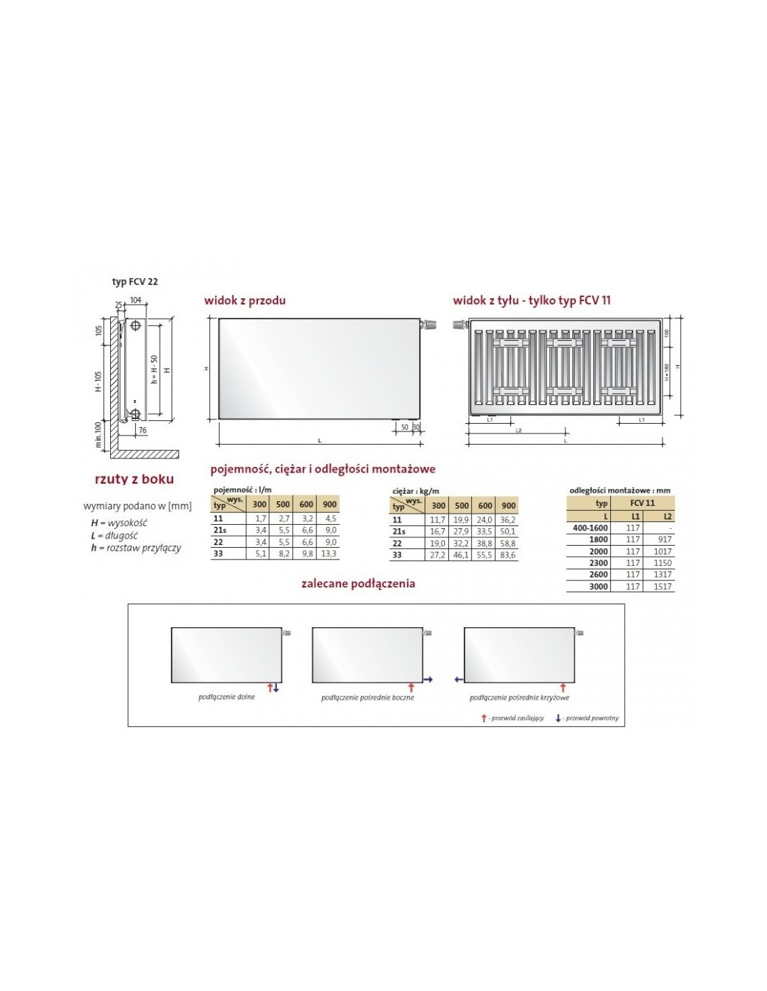 Grzejniki typu FCV wyposażone są w cztery boczne i dwa dolne otwory przyłączeniowe z gwintem wewnętrznym ½″. Króćce umieszczone od dołu pozwalają na dyskretne ukrycie instalacji.